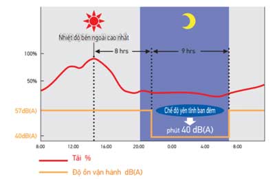 - Chế độ yên tính ban đêm có khả năng hoạt động với độ ồn thấp bằng việc giảm công suất. Tính năng được kích hoạt khi cài đặt ở công trình.