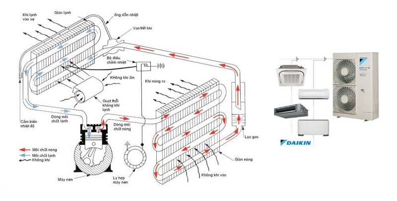 Tại dàn lạnh, quạt thổi phân phối không khí qua cánh tản nhiệt, truyền nhiệt từ phòng sang môi chất lạnh. Quá trình này làm giảm nhiệt độ không khí trong phòng, đồng thời lọc bụi và cải thiện chất lượng không khí. Mỗi dàn lạnh có thể điều chỉnh nhiệt độ riêng biệt, đáp ứng nhu cầu từng khu vực. Sau khi hấp thụ nhiệt, môi chất lạnh quay lại dàn nóng để tiếp tục chu trình, đảm bảo làm mát liên tục.